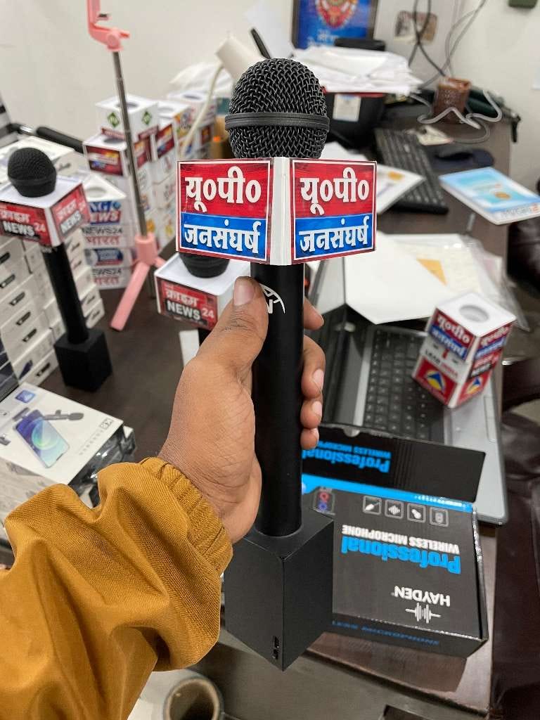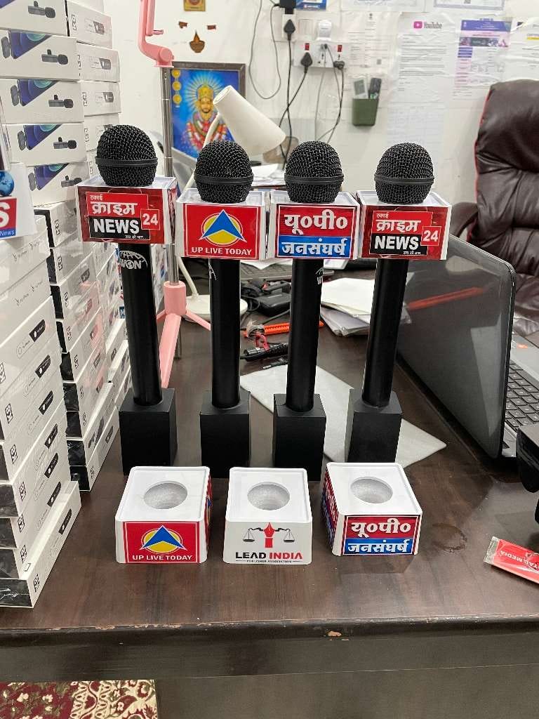 Blutooth media mic. Range 50 MTR. Battery backup 72hrs. Complete set one mic with 3×3 logo. print area with noise filter with charging cable.