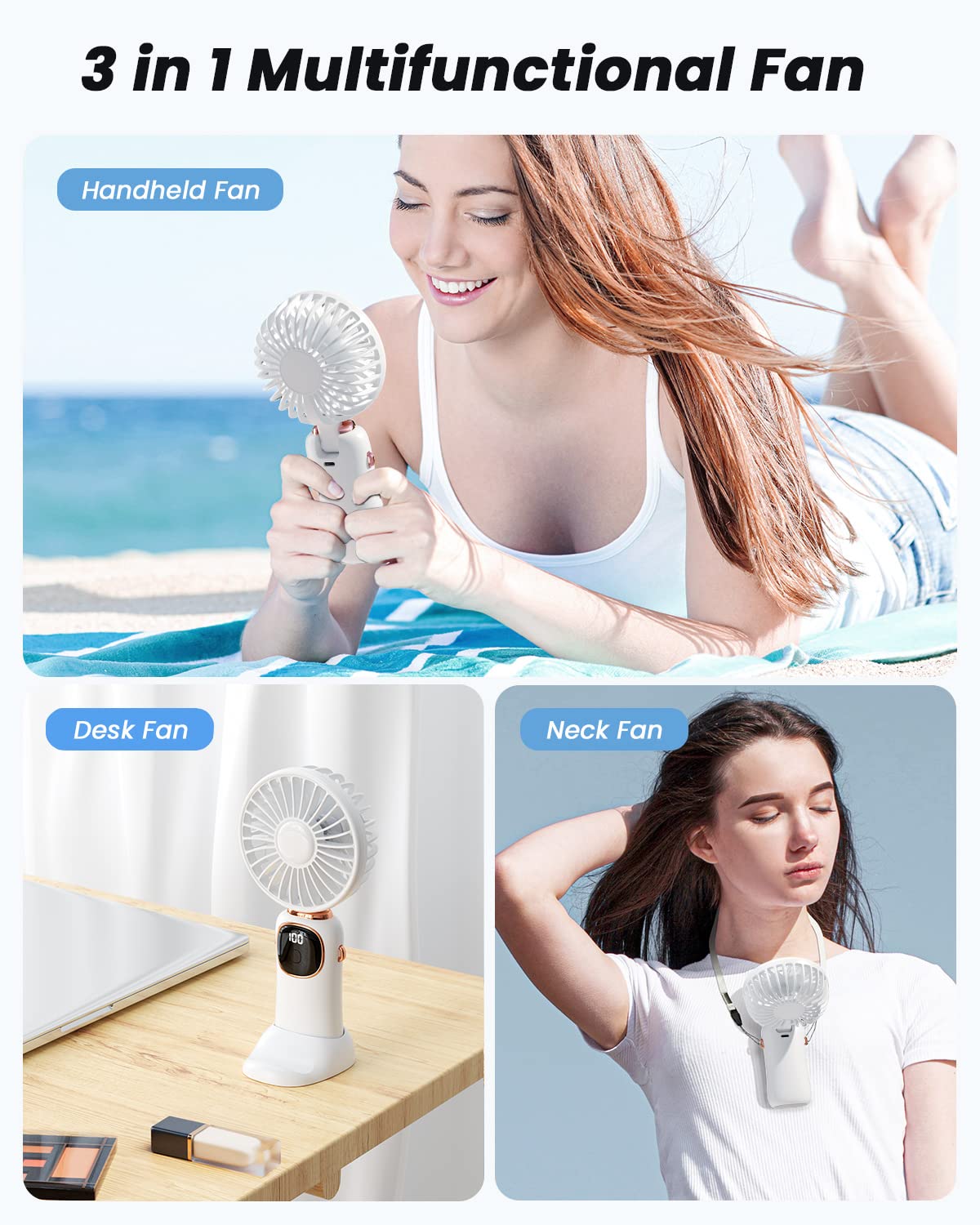 - 【𝟯-𝗶𝗻-𝟭 𝗠𝘂𝗹𝘁𝗶𝗳𝘂𝗻𝗰𝘁𝗶𝗼𝗻 𝗙𝗮𝗻】Use this fan as a handheld fan, neck fan, or desk fan. Our foldable fans are flexible with 90° vertical adjustment. Its adjustable design allows you to redirect the airflow and keep cool from any angle. Suitable for various settings and scenarios.