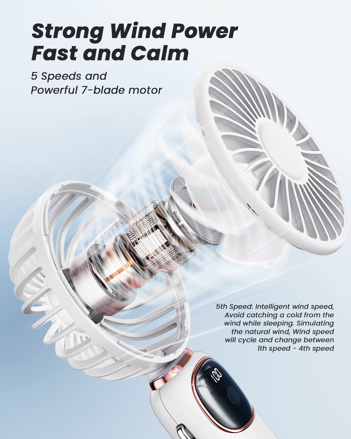 - 【𝗦𝗺𝗮𝗿𝘁 𝗗𝗶𝗴𝗶𝘁𝗮𝗹 𝗗𝗶𝘀𝗽𝗹𝗮𝘆】Small fan features smart digital screen that displays the remaining battery life and speed level. This will make it easier for you to adjust the fan to the ideal wind speed level and be more aware of when you need to charge the fan, which can avoid the fan running out of power while you’re outdoors.