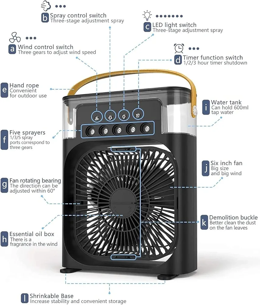 • 5 in 1 functional design, low-noise powerful fan, 5 large-caliber atomizers, essential oil aromatherapy tablets, 7 color lights, timer (1H / 2H / 3H) to meet all your needs